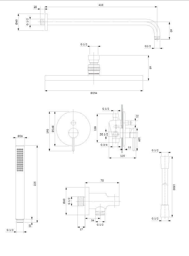 deszczownica z ramieniem mosiężna (WGSET1NI), rozmiar: ø25 cm, zasięg od ściany: 41 cm