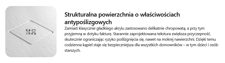 Brodzik kompozytowy Silia to uniwersalne rozwiązanie, które sprawdzi się w różnych aranżacjach łazienek. Dzięki technologii SOLID PLUS z kompozytowym wypełnieniem można go precyzyjnie dociąć w wyznaczonym obszarze, co pozwala dopasować brodzik nawet do nietypowych przestrzeni. Strukturalna powierzchnia o właściwościach antypoślizgowych zwiększa bezpieczeństwo użytkowania, a elegancka maskownica odpływu z logo Deante podkreśla dopracowany charakter produktu.