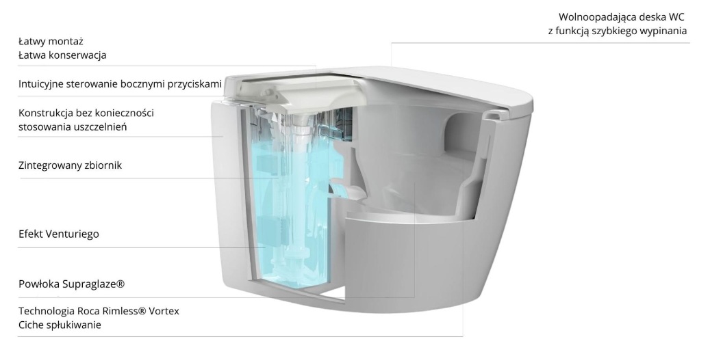 Miska WC z wbudowanym zbiornikiem wody In-Tank®, z wirowym systemem spłukiwania Roca Rimless® Vortex. Uruchamianie spłukiwania za pomocą przycisków na panelu bocznym. Odpływ uniwersalny - możliwość podłączenia do odpływu poziomego lub pionowego (w komplecie kolanko do odpływu pionowego właściwe dla rury kanalizacyjnej w odległości 21 cm od ściany). Wersja z wewnętrznym podłączeniem wody z tyłu miski - zalecany montaż podtynkowego zaworka odcinającego na zewnątrz toalety. Produkt wymaga podłączenia do zasilania 230V. Bez dodatkowych wymagań w zakresie ciśnienia i przepływu wody w instalacji. Powłoka Supraglaze® w standardzie. W komplecie deska wolnoopadająca z funkcją szybkiego demontażu. Łatwy dostęp serwisowy do zbiornika z zewnątrz.